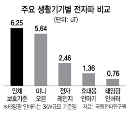 한국화학융합시험연구원의 ‘태양광 발전소 전자파 환경 조사연구’에 따르면 태양광발전소에서 나오는 전자파의 세기는 0.1~1.1μT이다. 정부 전자파 인체 보호기준(6.25μT)에 비해 많아 봐야 18% 미만이다. 특히 태양광 인버터의 경우 3㎾ 기준 0.76μT의 전자파를 나오는데, 이는 가정용 미니오븐(5.64μT)의 7분의 1 수준이며, 전자레인지(2.46μT)와 휴대용 안마기(1.36μT)보다도 적은 양이다.인버터에서 교류로 바뀐